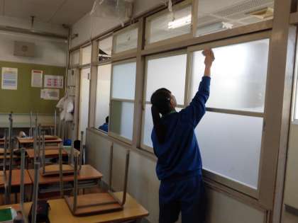 鷹来中学校では、掃除の時間に隅々まで汚れを落とせるように体操服に着替えて頑張ります。