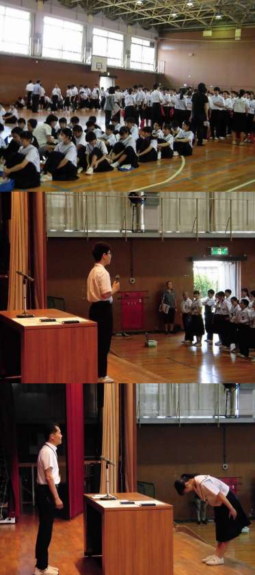 生徒会長の話では、第2回テストがおわり、3年生とって最後の大会となること。また現在ではお昼の放送で、生徒総会での質問に返答していることが話されました。そして今週魁ら生徒会によるあいさつ運動、ペットボトルキャップ回収、そして「鷹ギネス」がいよいよ始まることの話がありました。