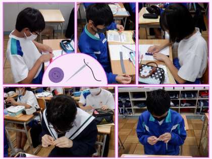写真上:2年生家庭科の授業の様子です。ボタンをつける練習をしまし
