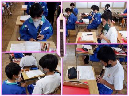 写真下:2年生音楽の授業の様子です。リコーダーで「浜辺の歌」を練