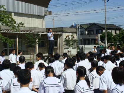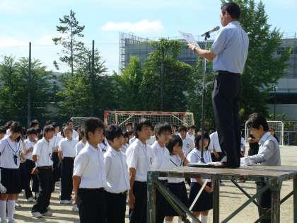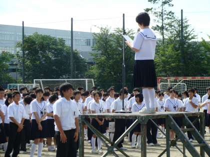 7月2日(月)の朝、全校集会が行われました。校長先生からは夏の大会や発表会に向けて、悔いのない2週間を送ってほしいことや挨拶運動への取組が良かったことが話されました。次に春日井市民体育大会で優秀な成績を収めたバドミントン部の生徒に向けた表彰が行われました。生徒会からは挨拶運動への取組が良かったクラスに対して感謝状が贈られました。清掃委員からはピカピカコンテストを行うことが伝達され、清掃活動をみんなでがんばろうと呼びかけがありました。1学期の締めくくりをしっかりしたいものです。
