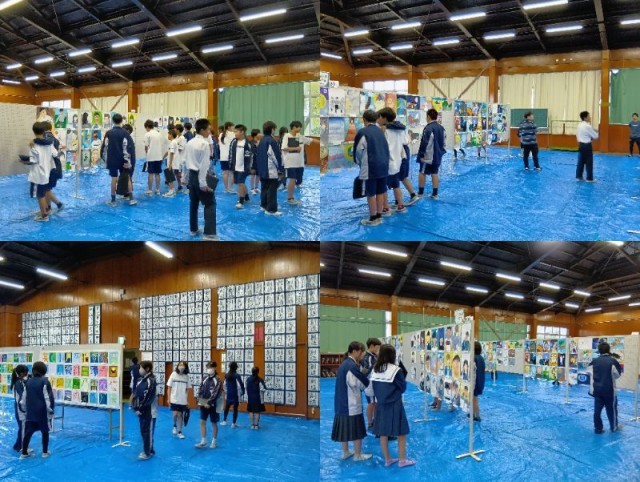 各学年ごとに展示鑑賞を行いました。国語・美術の授業で作成した作品や美術部の作品、PTA作品が展示されており、友達と様々な感想を伝えあいながら鑑賞をしていました。