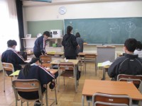 4時間目の授業が終わり、当番は手洗いをし白衣を着て配膳室に向かいます。(途中、白衣やマスクの点検も受けます。)