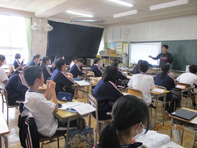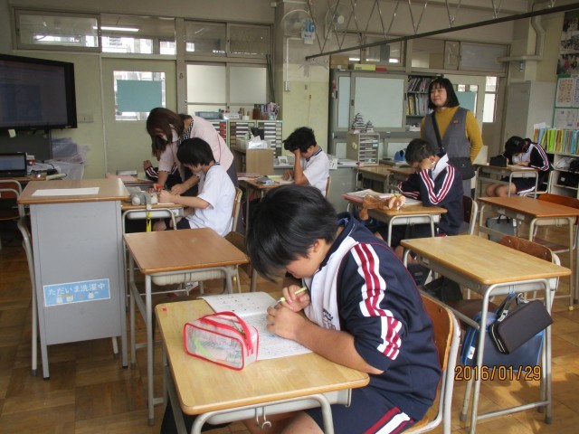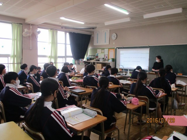 2年生の授業(英語・技術)とABCD組の国語の様子です。英語はとても大きな声で発音しています。