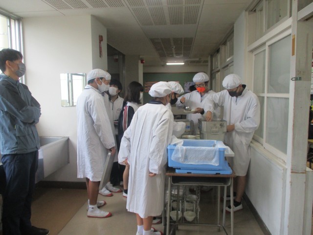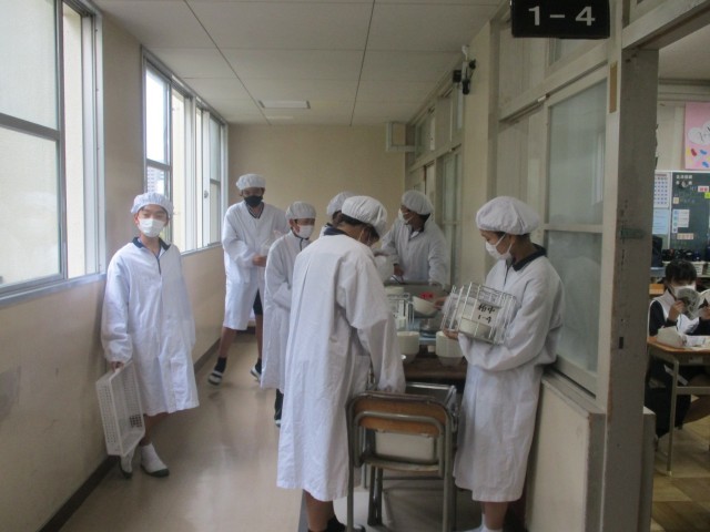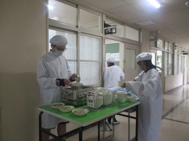 給食準備中です。本日のメニューは『ご飯 トックスープ じゃがいもの中華炒め 牛乳 きらず揚げ』です。