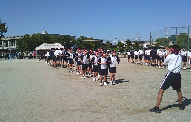 10月23日第47回体育大会を開催しました。学年ごとに行い、学級対抗全員リレー、学級対抗大繩とび、台風の目(1年)、ムカデ競走(2年)、学級対抗選抜リレーを競いました。全員が楽しみながら、一生懸命取り組みました。