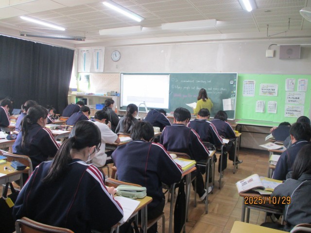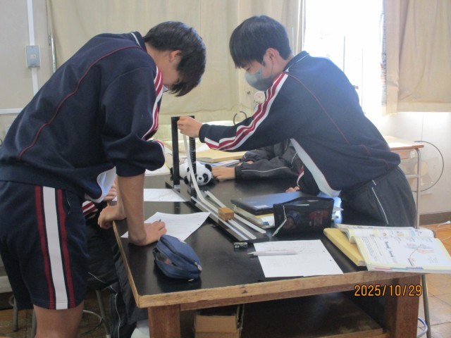 3年生の授業の様子です。(理科・英語)理科はエネルギーと仕事の関係について調べる実験です。