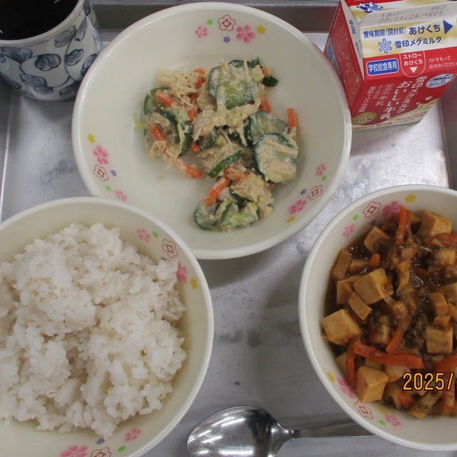 本日の献立は「麦ごはん、牛乳、マーボ豆腐、バンバンジーサラダ」です。落ち着いた雰囲気の中、準備しています。