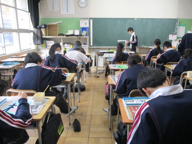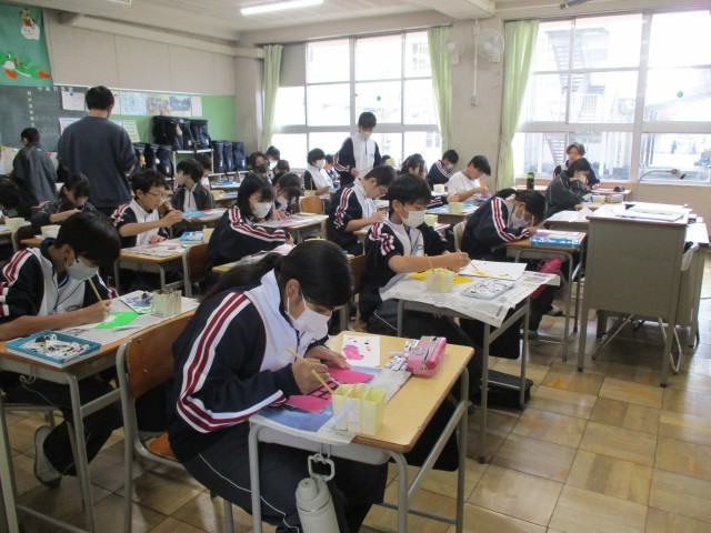 1年生の体育と美術です。体育はバレーボールの試合に向けて作戦を立てています。美術は絵文字の色塗りをしています。