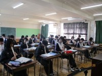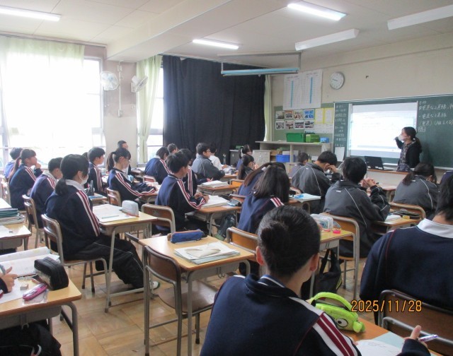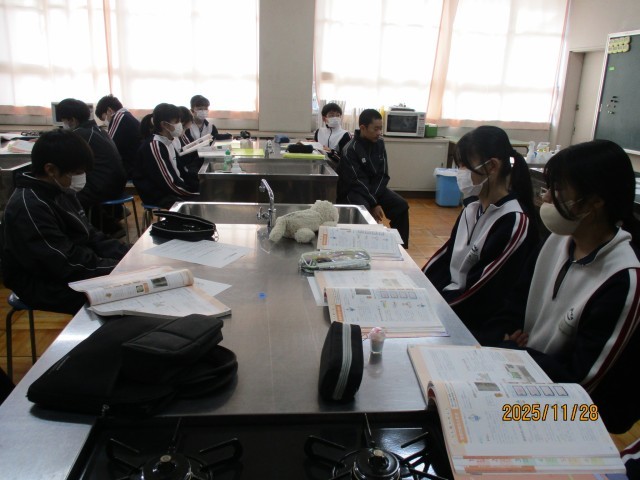 1年生の授業です。(国語・数学・家庭科)家庭科の授業では、初めての調理実習で白玉団子を作るので、そのための注意事項をしっかり聞いています。