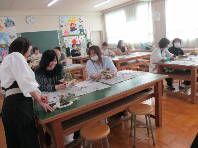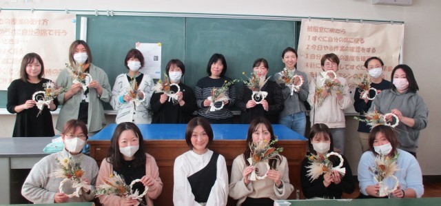 ドライフラワーを思い思いのデザインにアレンジし、しめ縄に飾り付けて完成させました。