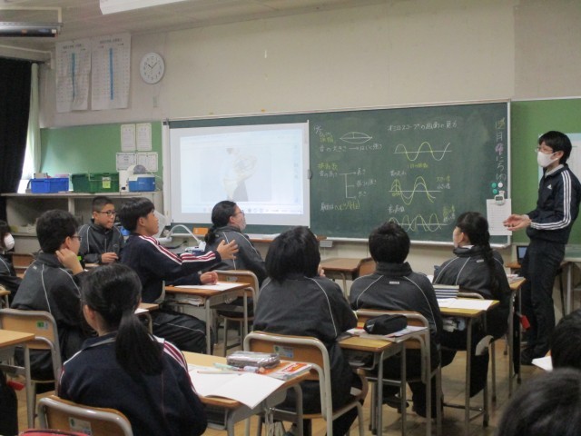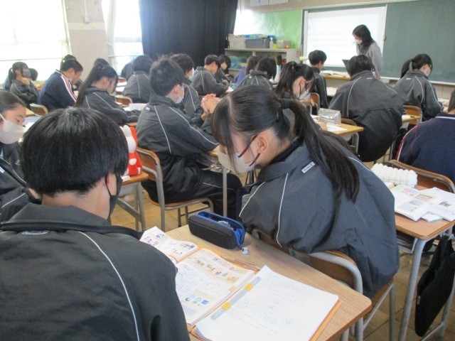 2年生(体育)、1年生(理科)、3年生(社会)の授業の様子です。3年生の社会は、2つの広告を使って、消費者の権利について考えていく場面です。