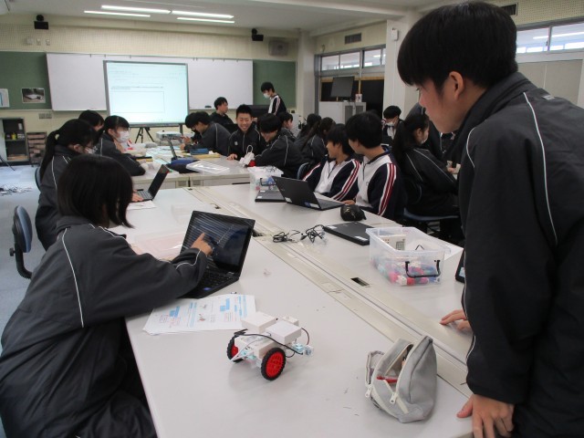 3年生の授業です。(技術・数学)技術のプログラミングの授業では、実際に車が動くか試しています。
