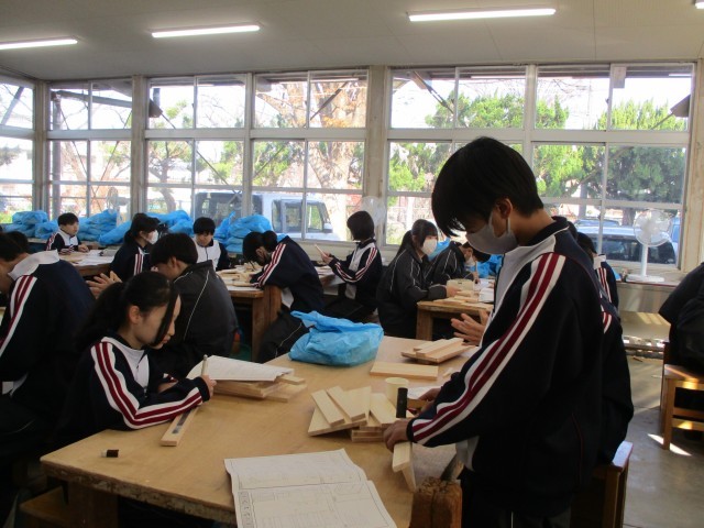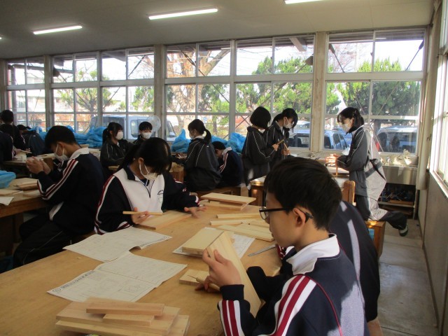 1年生の技術の授業です。生徒それぞれが、自身が使う収納ラックを製作しています。