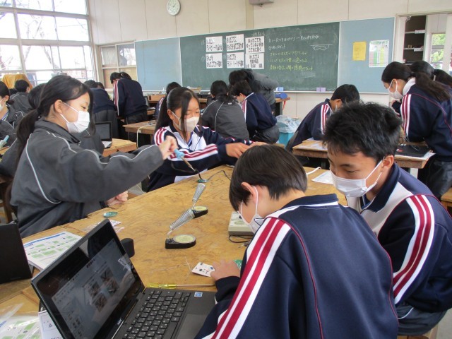 1年生体育はサッカーです。2年生の技術は「人感センサーライト」作りを始めました。はんだ付けをしています。ABCD組は刺し子に取り組んでいます。