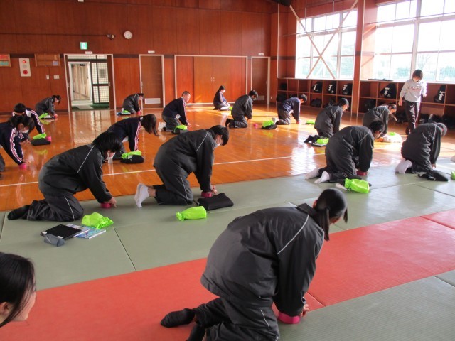 2年生の授業です。(体育・美術)体育の授業では、「心肺蘇生法」の実習を行っています。いざという時に大切な命を守るため、生徒たちは真剣な表情で、胸骨圧迫の手順を確認しています。