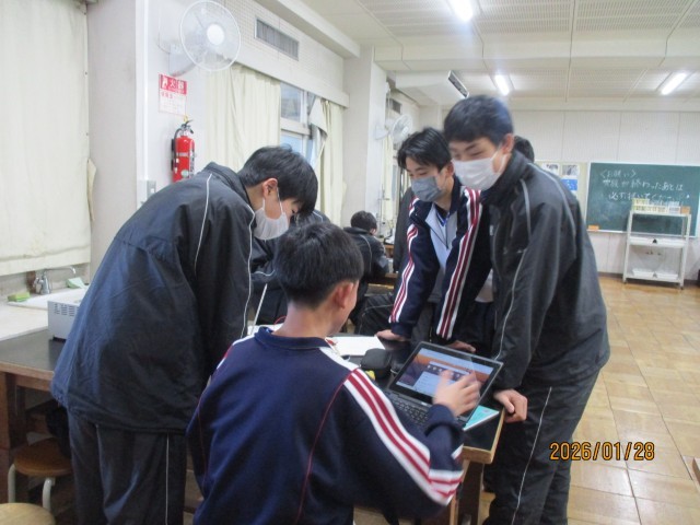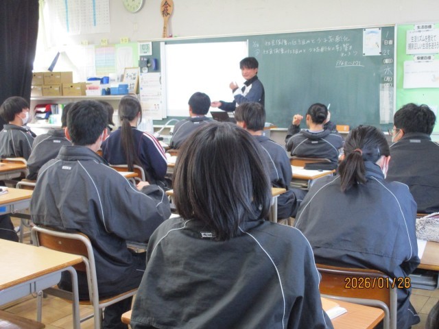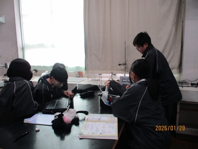 3年生の社会の授業と2年生の理科の様子です。理科の授業は「電圧を加えたときに発生する熱の量は何によって変わるのだろうか」を課題に実験しています。