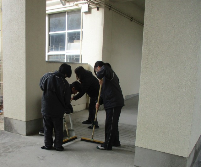 清掃の時間です。寒い中、頑張って校内をきれいにしています。