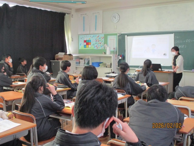 1年生の音楽は歌のテストを行っています。2年生の授業(家庭科・保健体育・社会)の家庭科では家庭内での事故の防止について学んでいます。