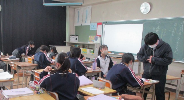1年生の授業(国語・理科)とABCD組の理科の授業の様子です。国語では文法を学んでいます。
