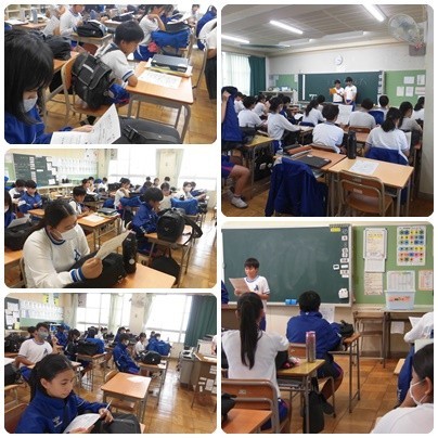 保健委員がほけんだよりを使ってミニ指導を行いました。10月の保健目標は「目を大切にしよう」です。スマホやゲームは、目から30cm以上離して使い、30分に1回は中断し目を休ませるなど、今すぐできる近視予防について紹介しました。また、「めざせ!Good Sleeper!!」のコーナーでは、休日に寝る時刻が遅くなっている実態調査の結果を示し、ソーシャルジェットラグ(社会的時差ぼけ)を防ぐために、平日も休日も、起床時刻や就寝時刻をなるべく同じにするように呼びかけました。