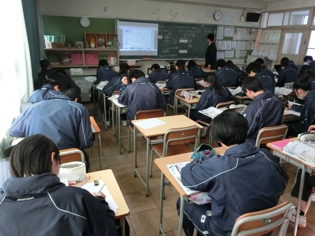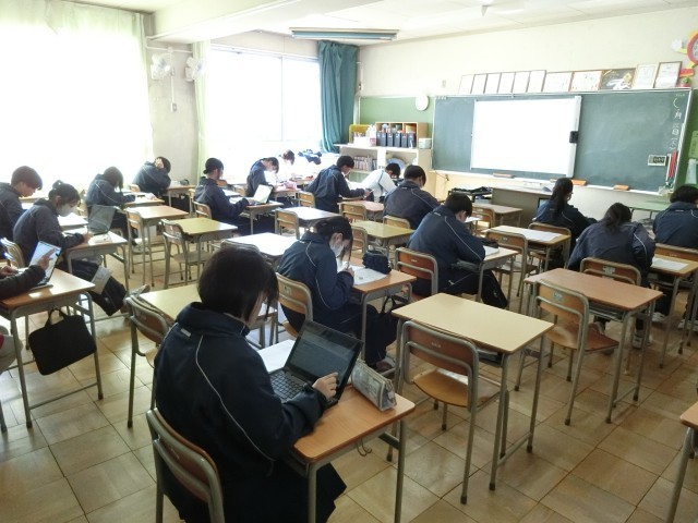 22日(木)は、3年生の私立高校受験2日目です。3年生の半分以上が受験に出かけたので、教室は閑散としていました。授業では自習を行い、課題に取り組んでいました。数学の授業では正多面体の性質の学習で、ある法則を見つけた瞬間に「おーなるほど!」と歓喜の声があがっていました。社会の授業ではロシアとアメリカが発展した様子を説明することを目的に、説明するための調べ学習を行っていました。