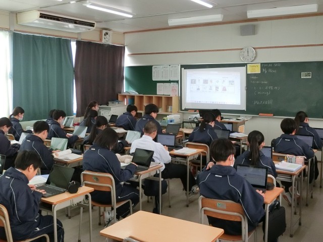4限の英語では、英文を聞いてどんな内容だったかをペアで共有したり、ヒーローの名鑑をつくるために英文を考えてタブレットに打ち込んだりしていました。また、別室でALTの先生と1対1で会話を行い、教室ではプリントを配付して課題に取り組んでいました。