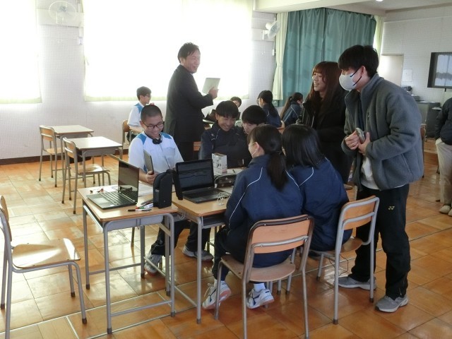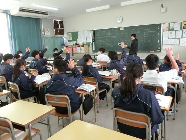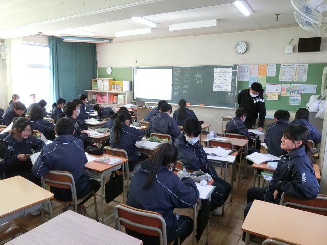 28日(水)の4限、音楽の授業では、先生が作った未完成の曲に管楽器や打楽器のリズムを付け加えてオリジナルの曲を作成し、班で作った曲を発表していました。体育の授業では持久走を行い、辛そうにしながらも自分のペースで決められた距離を走り抜くことができました。数学の授業では、平行四辺形になる条件や性質を活用しながらどんな四角形になるのかをペアで説明しあっていました。理科の授業では、地震に関する問題演習を行い、解説を聞いていました。