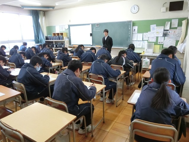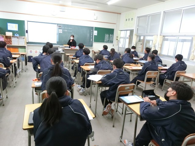 29日(木)の4限、数学の授業では入試問題プレテストに挑戦していました。とても集中しており、本番と同じ緊張感を感じることができました。英語の授業では単語の過去形を確認して、ペアで英語による会話でゲームを行っていました。清掃の時間は外も校舎内も寒い中ですが、がんばって自分の担当区域をきれいにしていました。みなさんで協力して、いつもきれいな南城中学校にしましょう。