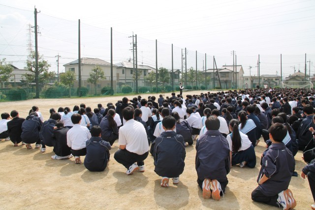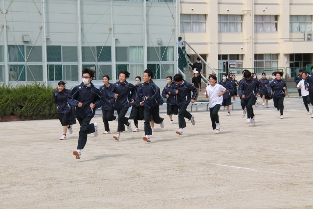14日(火)に第1回避難訓練を行いました。震度7の地震が発生して、調理室が火事になった時を想定して行いました。今回は「教室からの避難経路の確認」「運動場に避難する際の階段の指導の仕方」「運動場での並び方」の3つを目的としました。生徒の皆さんは先生の指示に従って、素早く避難することができました。