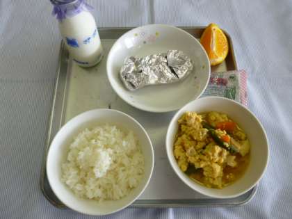 今日の給食は、ごはん、ミルク、高野豆腐の卵とじ、じゃがいものボイル蒸し