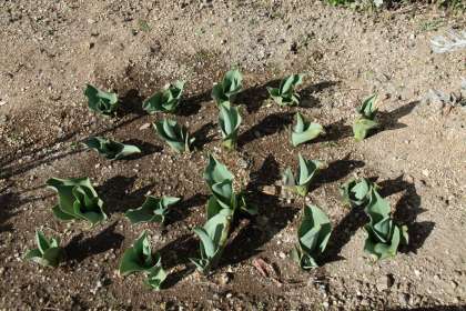 花壇のチューリップ。芽が葉になろうとしています。