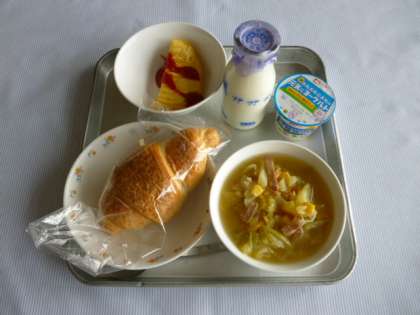 今日の給食は、クロワッサン、ミルク、キャベツのスープ、オムレツ、