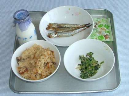 今日(3月14日)の給食です。メニューは,五目ごはん,牛乳,焼きししゃも,小松菜のさっぱりあえ,ミックスナッツでした。