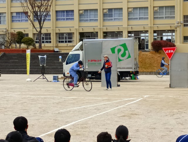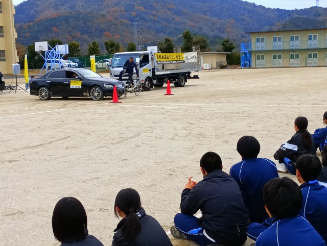 自転車運転に潜む危険やトラックの内輪差、自転車の乗り方など実演して頂きました。スタントマンの方の体をはった演技で生徒たちは自転車の乗り方について学ぶことができました。