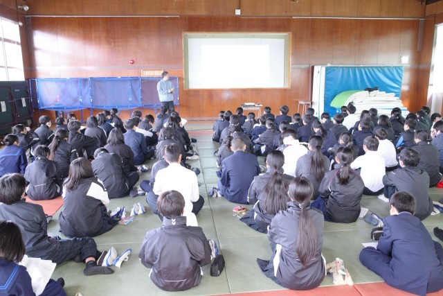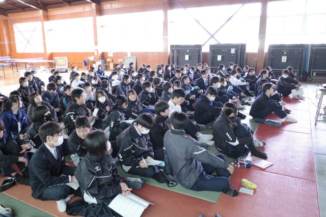 学活の時間に学年全体で進路学習を行いました。進路の考え方について、クイズを入れながら説明しました。今後は上級学校調べを進めていく予定です。