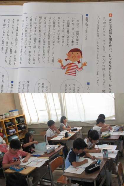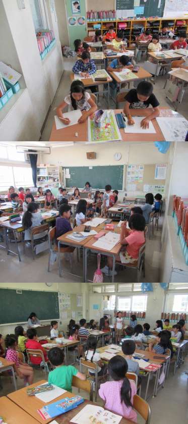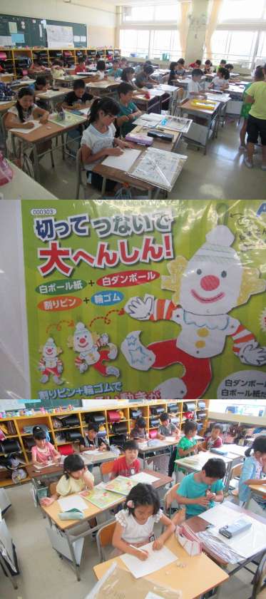 図工「切ってつないで大へんしん」と発表の様子(聞く姿勢も良いですね)