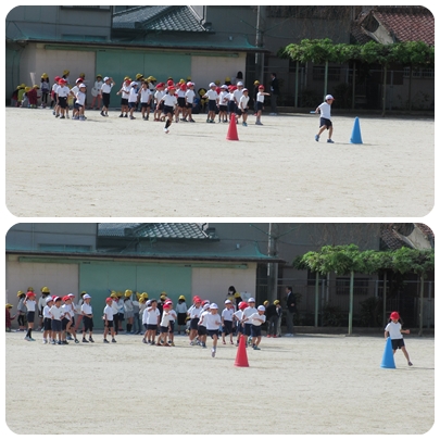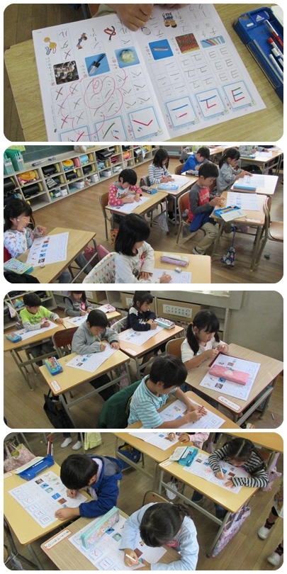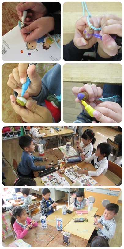 カタカナの練習 二子山公園で拾ったどんぐりに絵を描いています 体育