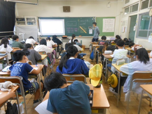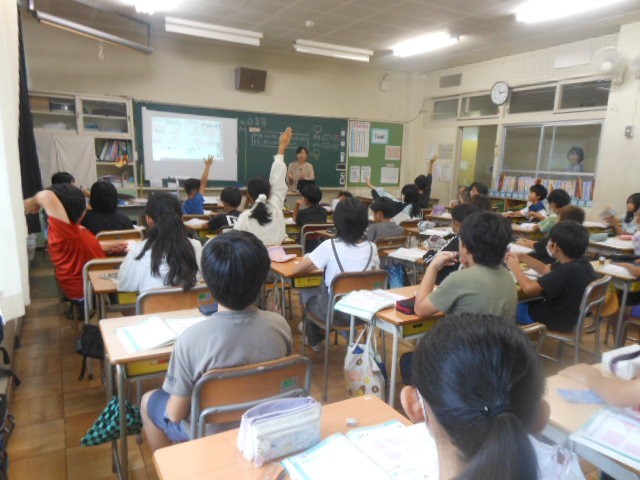 社会では課題に取り組み、キュビナで問題を解いています。算数では直角三角形の面積を求める問題に取り組んでいます。理科では水の流れについて動画を視聴しています。国語では文章を読んでその文章の間違いを探しています。