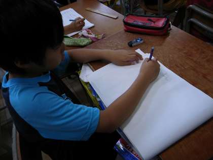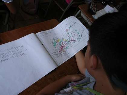 社会の白地図を作成し、そこから気づいたことを書く授業です。いろいろと考えています。まずは自分で考えて・・・。頭をフル回転! 今思考力が高まっている瞬間です。