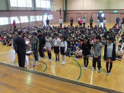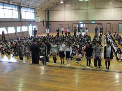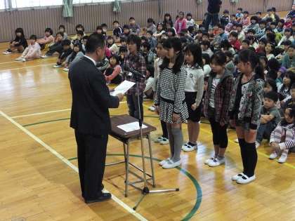4月はじめての朝会です。はじめに、児童会・学級委員・委員会の認証式を行いました。子どもたちは、静かに整列して式を聞くことができました。認証された人、がんばってくださいね。