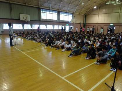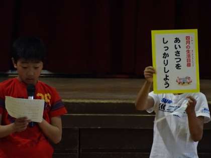 校長先生からは、あいさつについて、小学校1年生の作文が紹介されました。みなさん、気持ちのいい挨拶をしましょう。生活委員会からも、4月の目標が発表され、「『あいさつをしっかりしよう』です。しっかり守りましょう」と呼びかけがありました。また、生活の先生から、けがについてのお話がありました。