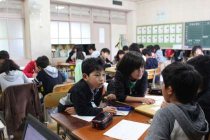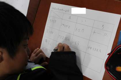 4月14日(火) 5年生の教室のようすです。6時間目は雨天で体育ができなかったので、学級が仲良くなることを目的に、室内レクを行いました。班で協力して楽しむことができました。