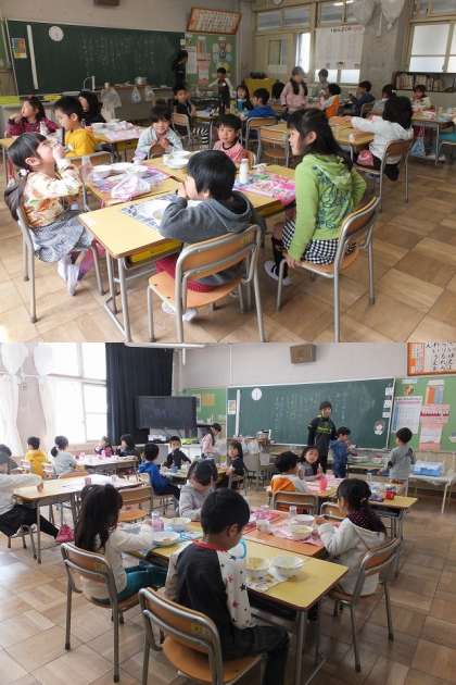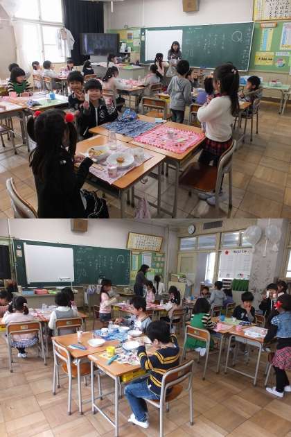今日から1年生も給食が開始されました。今日は初めての給食だったので、4時間目から準備を行いました。そのため、給食の時間に様子を見にいくと、給食をすでに食べ終わっている子もいました。どの子もほとんど残さずに食べていました。
