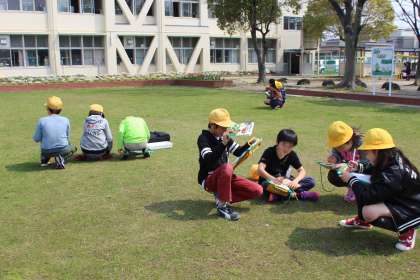 後半は学級の時間でした。下の写真は、理科で空の観察をしているようすです。午前と午後で空の色が変わっていくことに気づきながら観察することができました。
