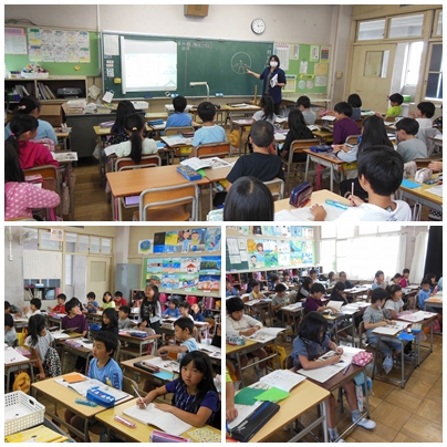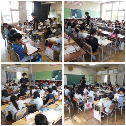 3年1組は算数の授業です。円を使った二等辺三角形の書き方について学習をしていました。2組は国語の授業です「ちいちゃんのかげおくり」という物語文に関して、場面ごとの読み取りをしていました。