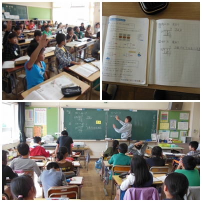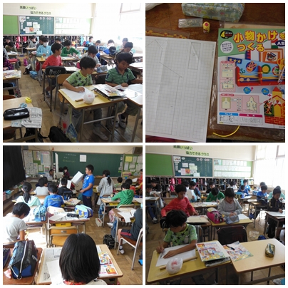 4年1組は算数の授業です。「わり算のせいしつ」に関する問題を解きながら、けた数が多い計算でも工夫をすることにより、暗算でできることを学習していました。2組は図工の授業です。「小物かけをつくる」ために、どのように板取りをするか考えていました。