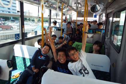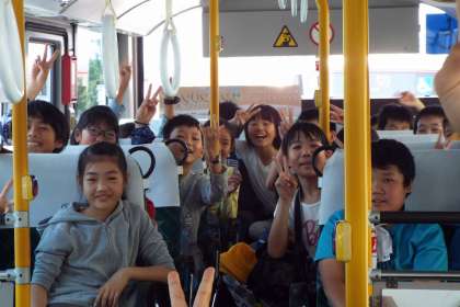 白山小学校から少年自然の家へ向かう、バスの中の様子です。みんな元気いっぱいです。