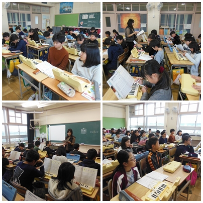 6年1組は音楽の授業です。「雨のうた」という曲を鍵盤ハーモニカで演奏するため、階名を確認していました。