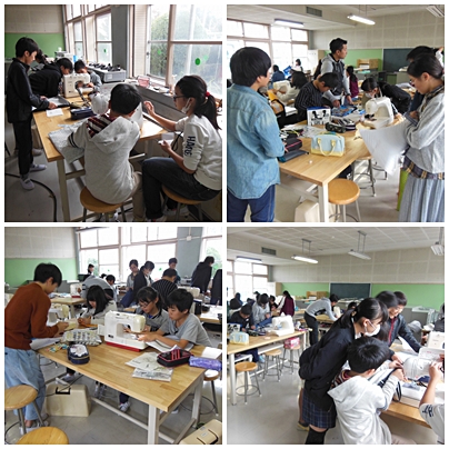 6年1組は家庭科の授業です。ミシンを使って、トートバッグやナップザックを作っていました。
